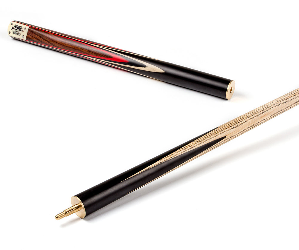 Grand Master - Layered Ebonised Black Wood is hand spliced on to the ash shaft. giving the instantly recognisable rounded finish to the four points. The butt is stained, not painted, to give a truly traditional, high quality appearance. On this cue, the veneers are all round - meaning that the design extends completely around the butt section. There are no decals on this cue - the veneers are genuine, and the splicing is exotic wood.