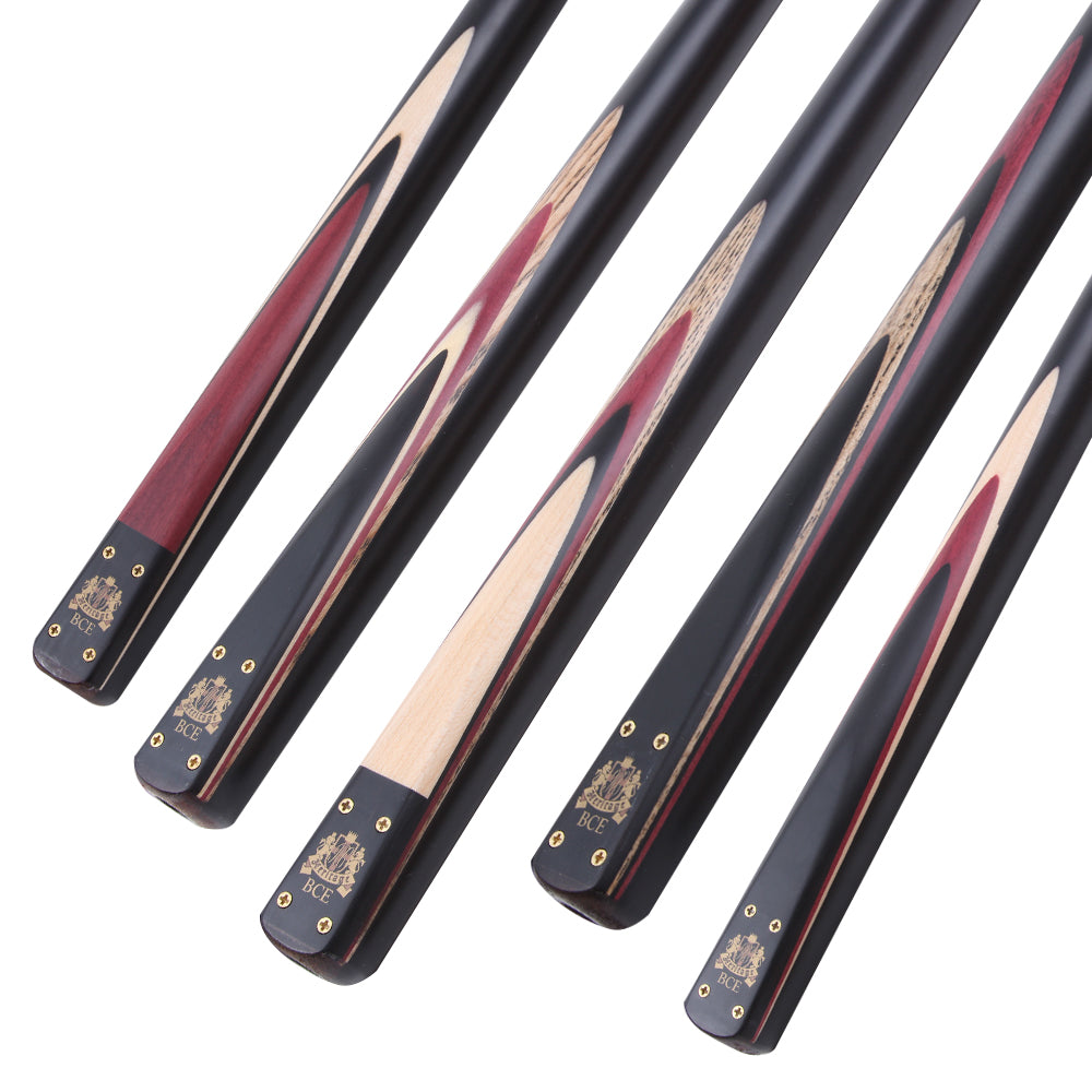 BCE Heritage Series - The Layered Ebonised Black Wood is hand spliced on to the ash shaft. Giving the instantly recognisable rounded finish to the four points. The butt is stained not painted, to give a truly traditional, high quality appearance. On this cue, you will find a beautifully inlayed, exotic wood front splice. There are no decals on this cue - the veneers and splicing are genuine solid wood inlays.