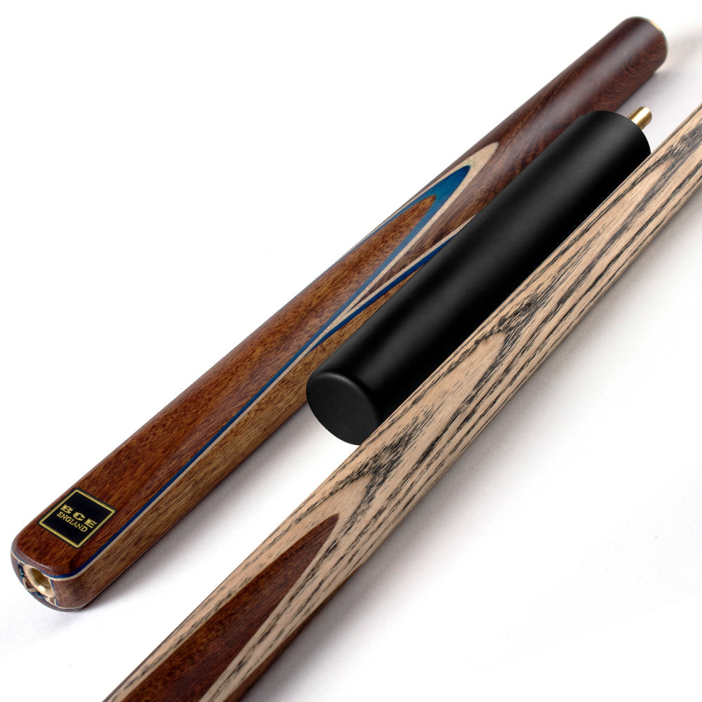 Tradition and natural beauty - No two cues are the same. This BCE 3/4 Cut three piece snooker cues have shafts constructed from the highest grade North American Ash combined with hand spliced butts from Natural Teak wood and varying, genuine wood veneer, butt designs.