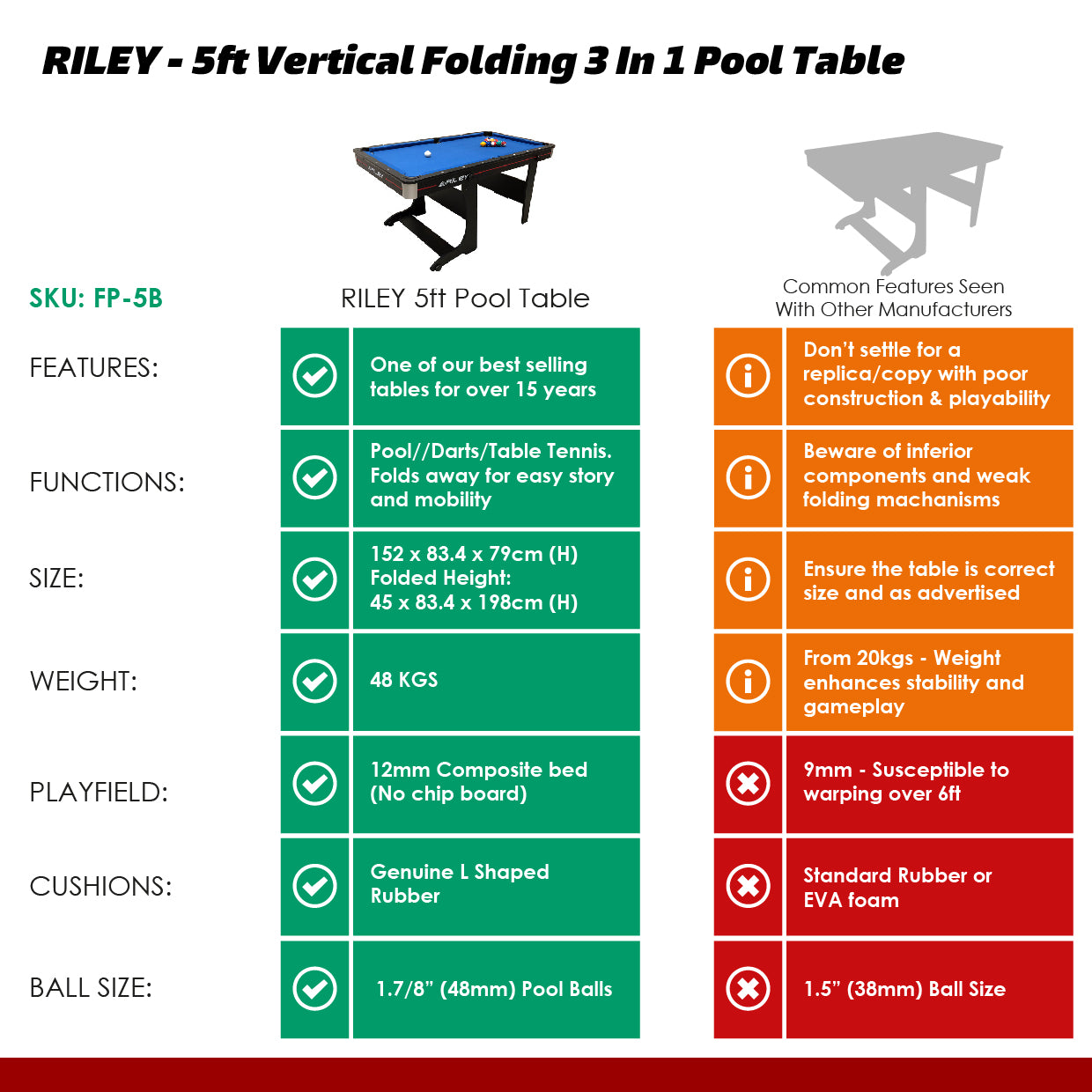 - ORIGINAL AND UNMATCHED: The pioneering Riley 5’ Pool Table, a trailblazer in the market, uniquely combines robust construction with the innovative Riley-designed folding leg system. Imitated but never duplicated, it's a testament to quality and ingenuity.